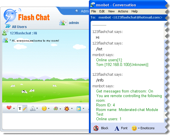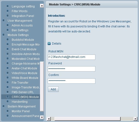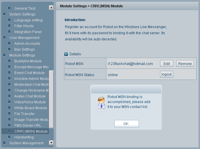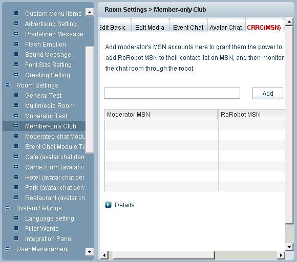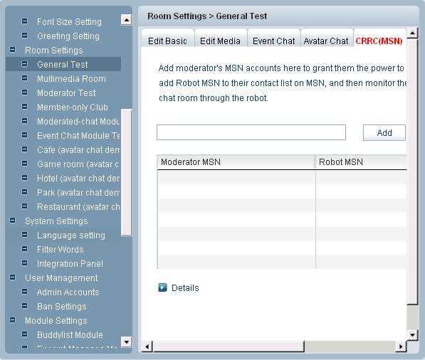 CRRC (MSN) is the abbreviation of Chat Room Remote Controller (MSN edition). Room owner can create a chat robot in a particular chat room and then grant the access of the robot to the reliable person(s) to remote monitor his rooms via MSN. It can be done in the following steps: 1.Create Robot MSN Account If your MSN account is correct, the following window would open: You can edit, remove your robot MSN or view its status. 3. Add moderator’s MSN accounts Navigate to the configuration panel of the room you want to monitor with MSN robot, input moderator's MSN accounts, click the Add button, you will see the moderator and the robot accounts appear in the filed below. 4.Monitor room via Robot After binding Robot account with some chat room, moderator can add the Robot account into its contact list on MSN, and then monitor the chat room via the robot account. Tips /enable Enable to get messages from chatroom. /disable Disable messages from chatroom. /list Check online userlist in current room. /kick Kick user out, eg: /kick username /ban Ban user ID or IP, eg: /ban username or/ban 61.239.186.94 /unban Unban user ID or IP, eg: /unban username or/unban 61.239.186.94 /info Get remote control status.