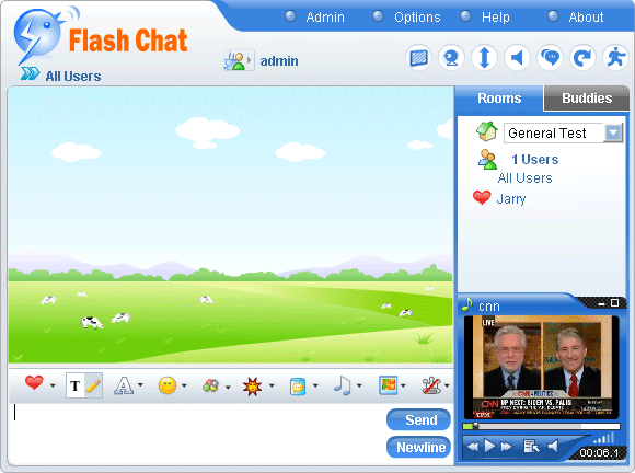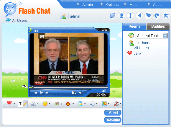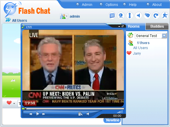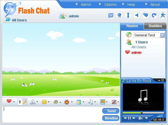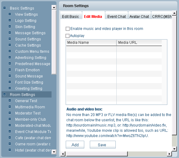 Note: After finishing your choices, you can press Save button to save your settings, or Reset to set again. Click Edit Media tab, the following window would open : Check Enable music and video player in this room first and then press Add button , you can add the music and video with the media name entered in the left blank field and media URL in the right. Press Save button to complete this process. Checking Autoplay could make the room play music automatically when it is loaded. The support audio formate are mp3 and flv . A flash player playing mp3 file . A flash player playing flv file. The max button: A float window would open after clicking the max button. You can resize the window to suit your need. After re-clicking the button, the player would be withdrawn to its original position. The min button: You can hide the player by using the min button. The playlist button: You can select your favorite video/audio in the playlist. The mute button: You can turn off the audio quickly by using mute button. The volume slider: You can adjust the volume by moving volume slider. Click Event Chat tab, you will see the following window : Event Chat can be used for the chat that start and end at certain time, such as giving a lecture or an oral examination.