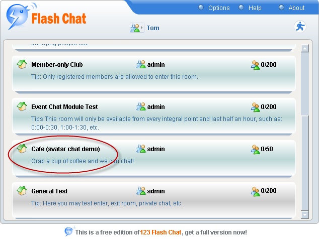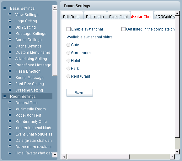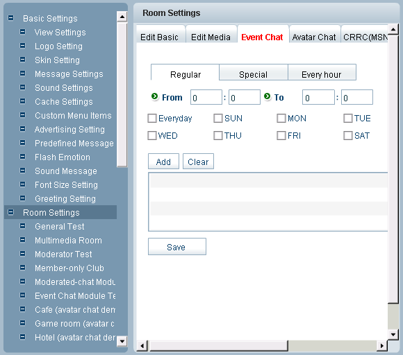 Set the particular time you want in the room and click Add to set a rule and then press Save button to complete this process. In this optional chat module, text chat room can be transformed to avatar chat in which you can walk around to "meet people" and gossip with them. The scenes are: cafe, game room, hotel, park, and restaurant. To log in avatar chat