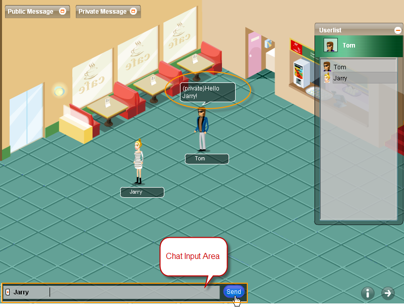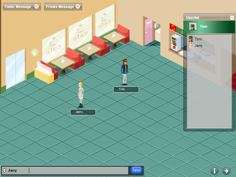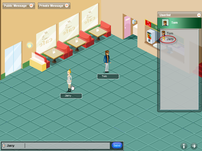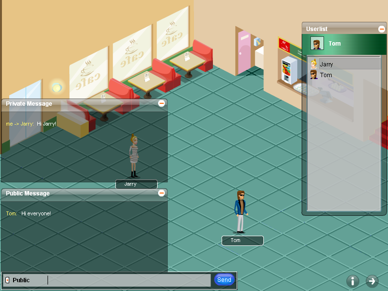 Select an avatar, fill in the required fields, select a room, click Chat, then you would be redirected to the room(let’s take Café as example): To walk around in the room To chat You can begin your chat by clicking the avatar or its username in the Userlist. Enter your message in the chat input area, and click Send. To view public and private message You can view public message and private message by clicking the corresponding window in the scene. To quit avatar chat You can quit avatar chat by using quit buttonTo get avatar chat listed in the complete chat room Clicking Get listed in the complete chat room and Save button, you can get avatar chat listed in the chat room list.