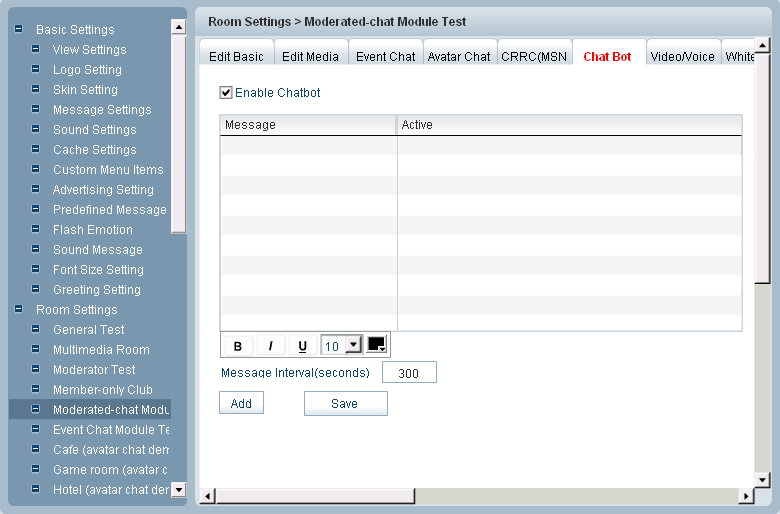 Click Chat Bot tab, you will see the following window: It can be used for site news or text advertisements. With Chat Bot, specific message(s) can be broadcast to specific rooms or all rooms at predefined intervals. Messages can be added, edited and removed from the list. There can be multiple messages for one room, or one message for all rooms. You can operate as follows: Click Enable Chatbot tab and then press Add, you can add message(s) you like to the blank listbox where the font size or shape can be edited by the buttons at the bottom. All the message(s) you have added can only be broadcasted by clicking Active button. You can also define the interval of message-broadcasting. After doing that, you can press Save to finish the whole process.