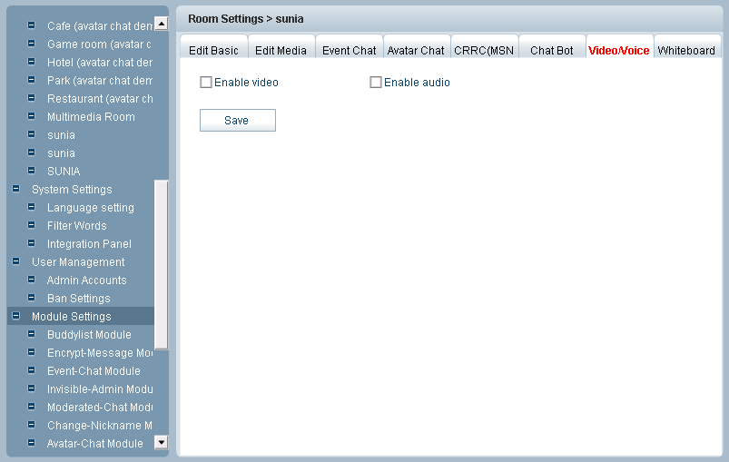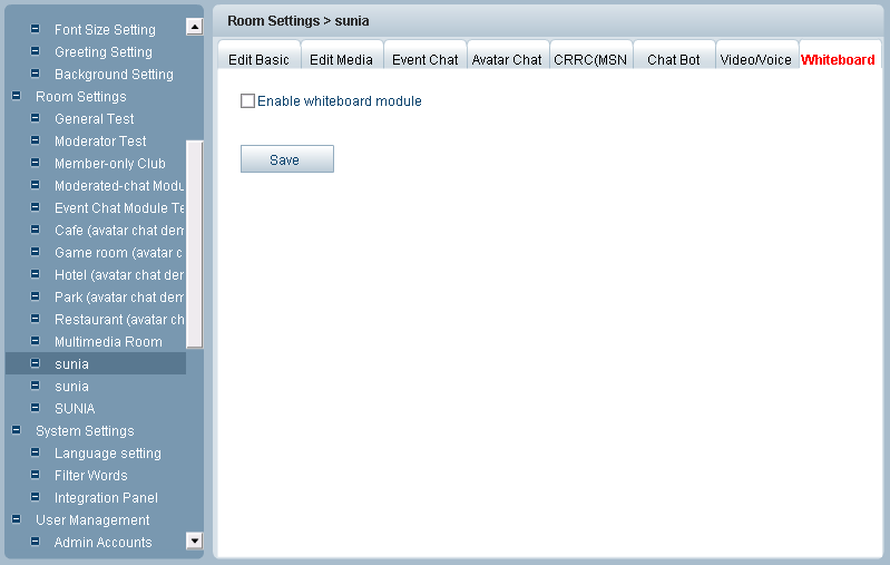 Note: since Video/Voice is not a free module, so it would not be available before you pay. Click Whiteboard tab, you will see the following window : In this optional chat module, you can use whiteboard to make drawing during chat and all other users in the same room can share the drawings or draw together with you. You can enable the whiteboard by checking Enable Whiteboard module and click Save to finish the process.