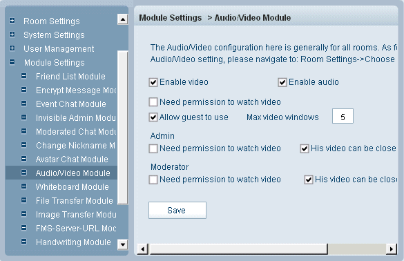 With audio/video module enabled, you can add webcam and voice chat feature in your chat room.