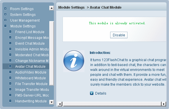 Home > Admin Panel > Module Settings > Avatar Chat module