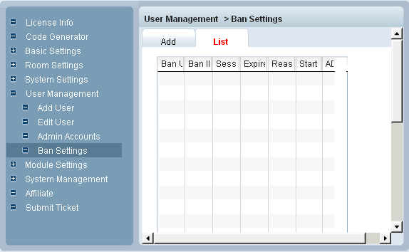 Input the user name, click Add, all users that been banned will appear in the list tab.
