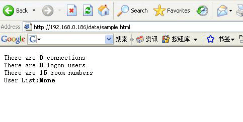 <script language="javascript" src="path/connections.php"></script> in the pagea of your website, then the corresponding data will be displayed. The sample.html, code in chatdata.zip are: There are <b><script language="javascript" src="connections.php"></script></b> connections<br> There are <b><script language="javascript" src="logon_users.php"></script></b> logon users<br>> There are <b><script language="javascript" src="room_numbers.php"></script></b> room numbers<br>> User LIst: <b><script language="javascript" src="user_list.php"></script></b> You will see the following picture : ![]()