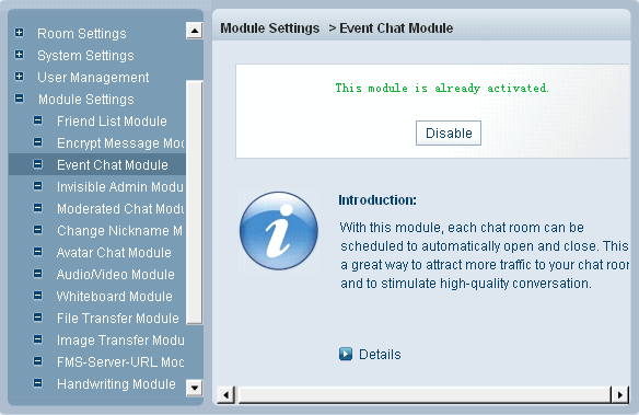 With this module enabled, each chat room can be scheduled to automatically open and close. This is a great way to attract more traffic to your chat room and to stimulate high-quality conversation.
