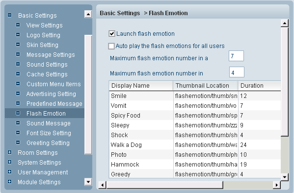 Here you can "launch flash emotion" by checking the item. Then you can use flash emotion in chat room. The name, quantity ,duration , location and thumbnail of flash emotion can be defined here.