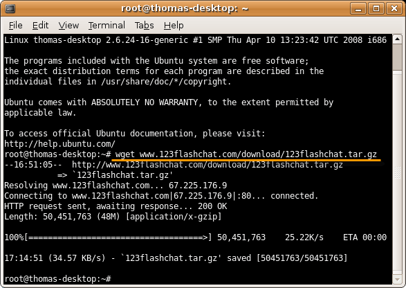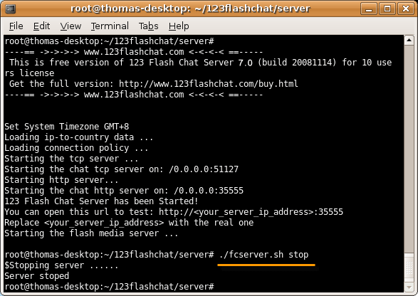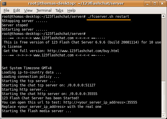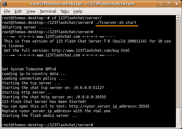 For Linux UserTo install 123 Flash Chat Server on Linux 1.If you are in a local Linux console window, please skip this step. If you need to remote control Linux server, you need to SSH to your Linux server first. 2.Download the latest Linux version of 123 Flash Chat Server software using the following command: $ wget http://www.123flashchat.com/download/123flashchat.tar.gz 3.Uncompress the 123flashchat.tar.gz