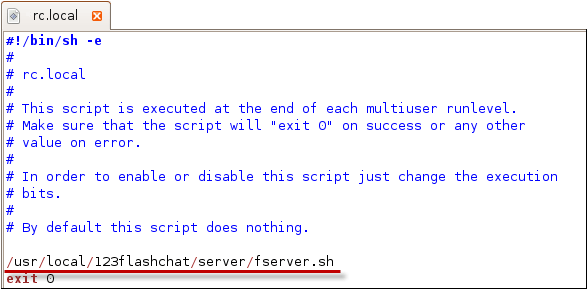 To run chat server when starts your server 1.Modify "fcserver.sh", find the FCSERVER_HOME section, and configure the directory of "fcserver.sh". FCSERVER_HOME=/usr/local/123flashchat/server