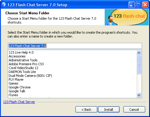 5. Enter your destination folder, for example D:\ProgramFiles\123FlashChatServer 6.9.5 a nd click Next. 6. Click Install and it will take a few seconds to complete the installation. 7. Click Finish to complete the installation. After 123 Flash Chat Server has been installed, please wait a few seconds. 123 Flash Chat Server will be automatically started as a Windows NT service. (Usually you need not to start it manually). 8. Start 123flashchat manually: 9. Stop 123flashchat manually: 10. Restart 123flashchat manually: After installation, if you may need to store your data (such as your old user information and room information) in MySQL, please click here. Related links: