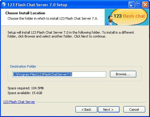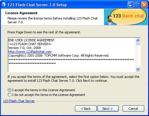 For Windows User To install 123 Flash Chat Server on Windows 1. Download the latest Windows version of 123 Flash Chat Server Software at: http://www.123flashchat.com/download.html. 2. Double-click 123flashchat.exe: 3. Click Next button: 4. Select I accept the terms in the License Agreement, click Next button ;