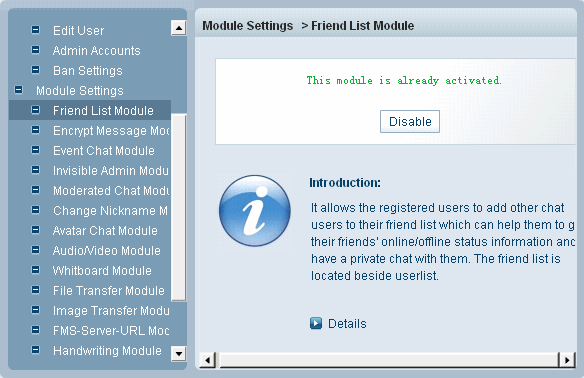 You can enable/disable this module by clicking Disable button. For more information, please click Details.