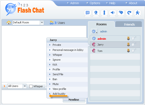 With Friend List module, registered users can add a chat user to his friend list, get their online/offline status and, chat with them in private chat mode, delete a friend from the friend list. The friend list lies at the right side of the chat room userlist.