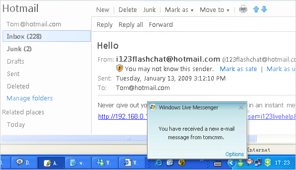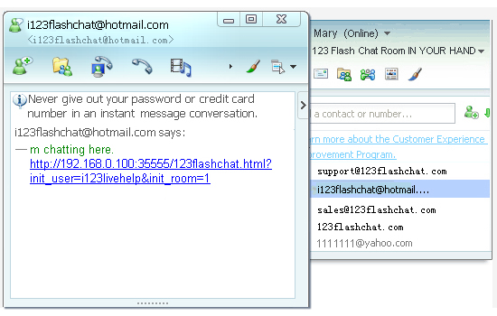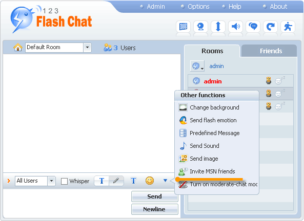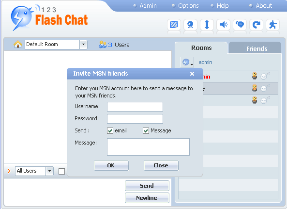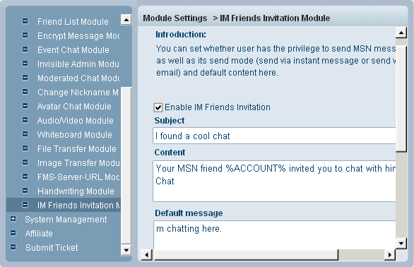 Wanna attract more users for your chat room?Try IM Friends Invitation Module. After activating the module, your user then could invited his MSN friends to join your chat, but before this actually happens, please fill in your advertising claim in Default Message and select its send mode: Immediately will send your default massage via instant message, Email will send it via an email. Sending email may need the support of SMTP server, in default mode, we use the embedding SMTP server. But if you need to use outside SMTP server, you may configure this node: <mail-smtp-server ...> in this file : <123flashchat install directory>/server/etc/fcserver.xml . Instant Message: