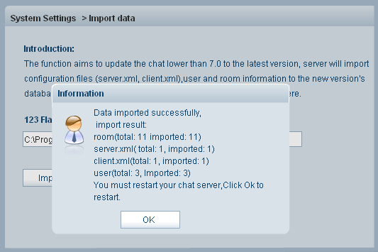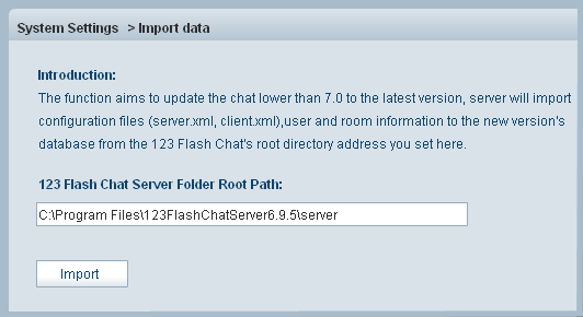 The function mainly aims to help you import old configuration data (such as room and user information) from your former 123 Flash Chat.
