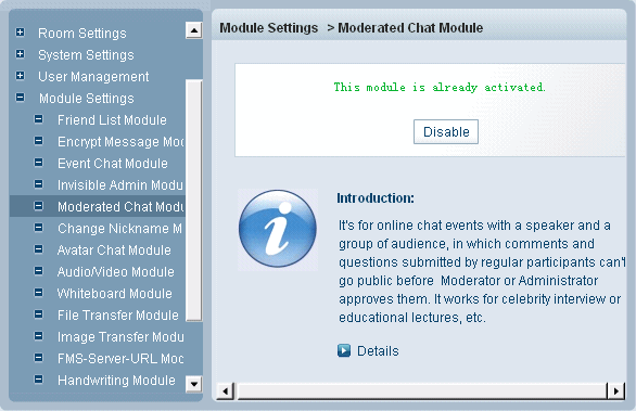 Home > Admin Panel > Module Settings > Moderated Chat Module