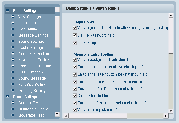 Here you configure login panel, message entry toolbar, room list, right-top toolbar and user list status.