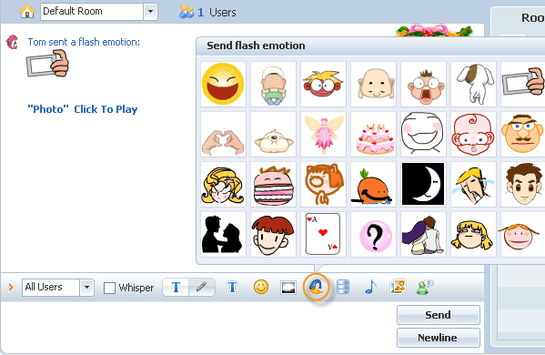 Enable the flash emotion button to allow animated flash emotions in chat With this featured enabled, a user can use animated flash motions in chat.